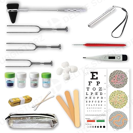 All essential instruments for evaluating vital signs, neurological status, ENT findings, and general physical parameters.